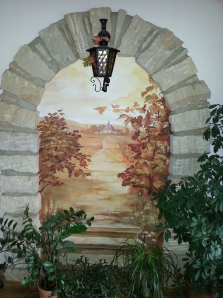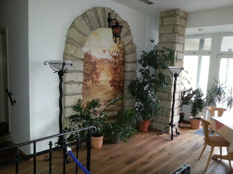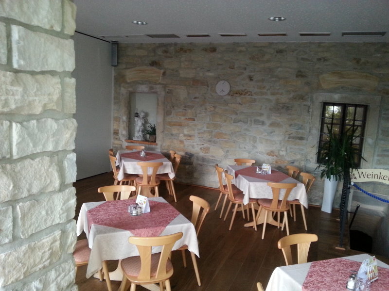 Im Sandsteinzimmer finden Sie nahezu alles in Stein und Holz. Gegenüber der ehemaligen Außenwand des Gasthofes ist alles Glas und der Blick geht über den Biergarten bis nach Freital und zum Windberg.