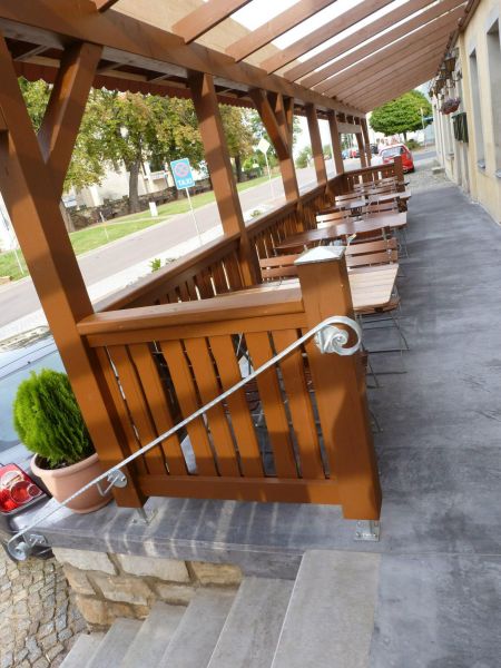 Die überdachte Weinterrasse läßt Sie auch bei Regen beruhigt und trocken im Freien sitzen. Gemütliche Stunden bei Kerzenschein nicht nur zum Pesterwitzer Weinfest garantiert. Nur schnell den Durst löschen oder genussvoll eine Flasche Pesterwitzer Wein trinken, alles ist möglich.